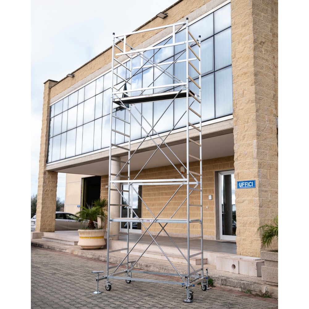Per l'utilizzo semiprofessionale e per il fai da te. Trabattello in acciaio zincato elettrolitico. Facilissimo da montare e smontare. Smontando l'asta laterale può passare attraverso porte e corridoi. Maneggevole grazie alle sue campate da 175 cm. Poco ingombrante, leggero e sicuro. Corredato di 4 ruote diametro 125 mm. I tiranti diagonali sono facilmente applicabili su appositi bussolotti alettati senza alcun uso di viti e bulloni. Completo di certificato di conformità.
